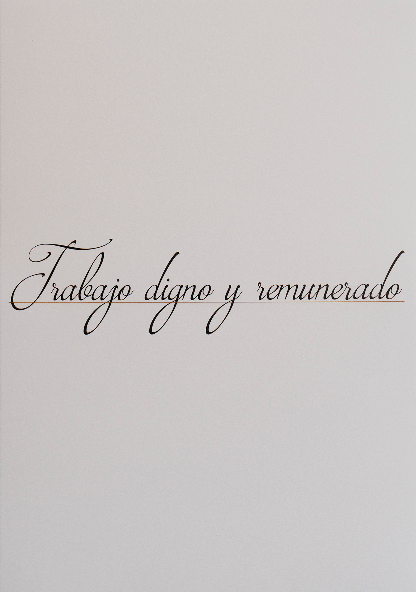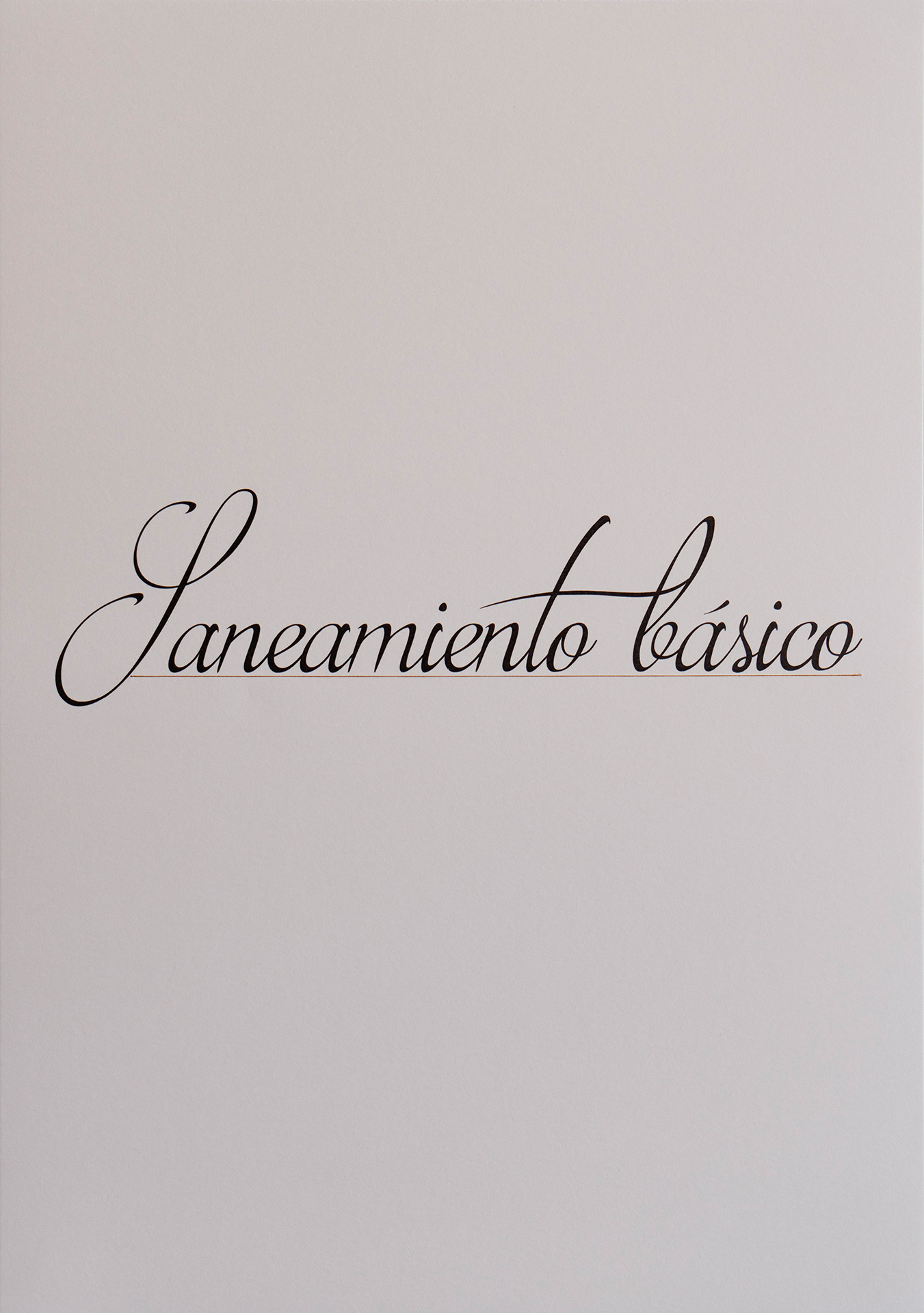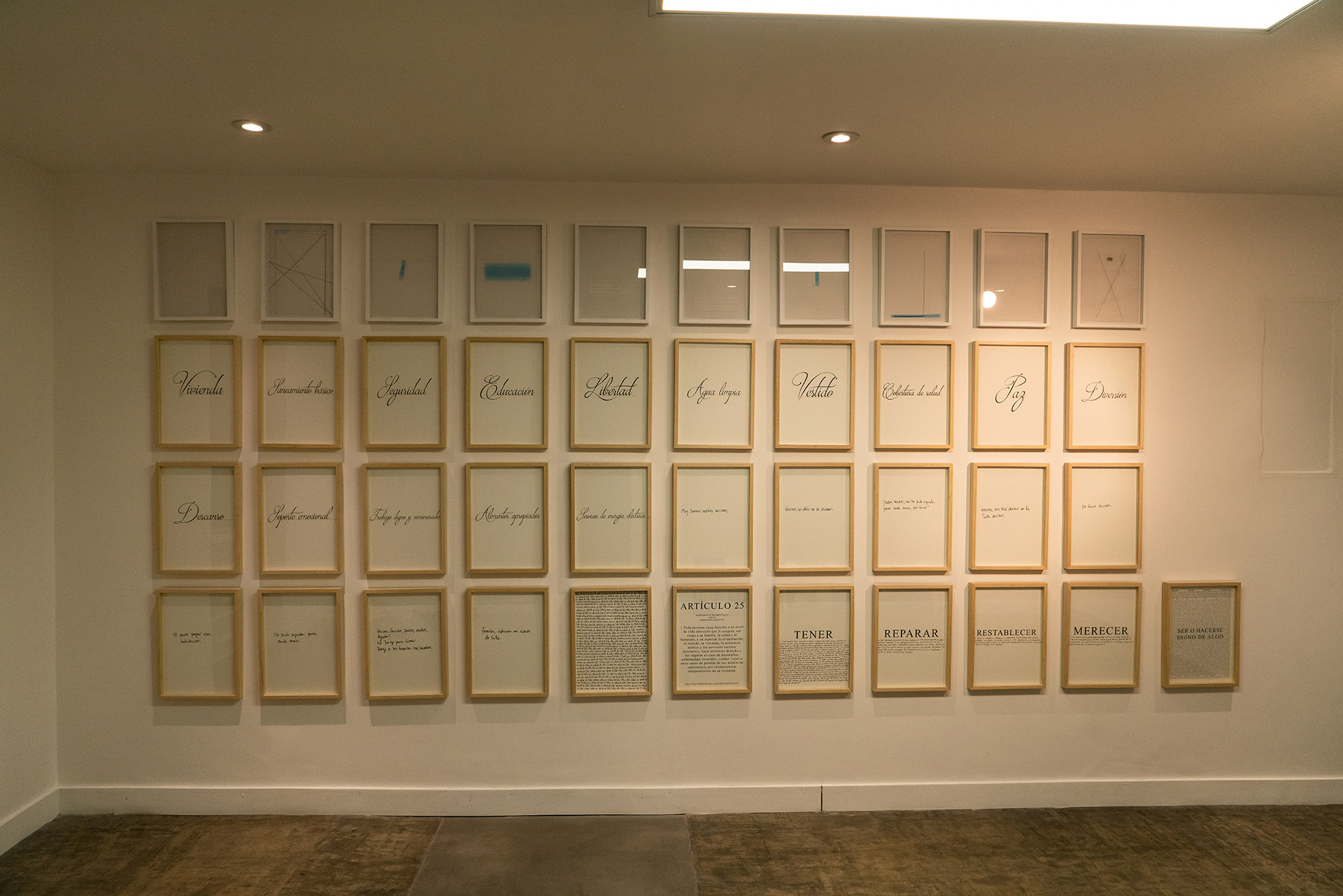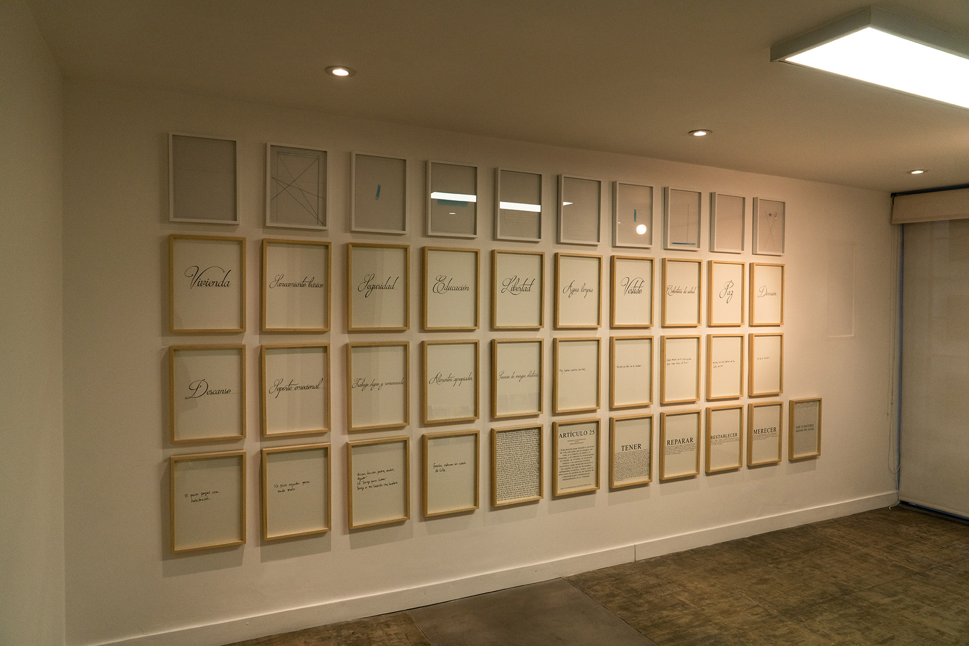 Segunda parte: está compuesta por 15 intervenciones sobre papel. Quince palabras y frases que aluden a las necesidades básicas de cada ser humano. Estas son: Vivienda, saneamiento básico, seguridad, educación, libertad, agua limpia, vestido, cobertura de salud, paz, diversión, descanso, soporte emocional, trabajo digno y remunerado, alimentos apropiados, servicio de energía eléctrica. Cada palabra o frase está intervenida con hilo dorado; hago referencia a los antiguos papiros en los que se usaba tinta dorada y negra para resaltar y embellecer los documentos oficiales. De alguna manera, para elegantizar algo que realmente debería darse sin tantos protocolos. De esta premisa, nace también la elección de la tipografía.