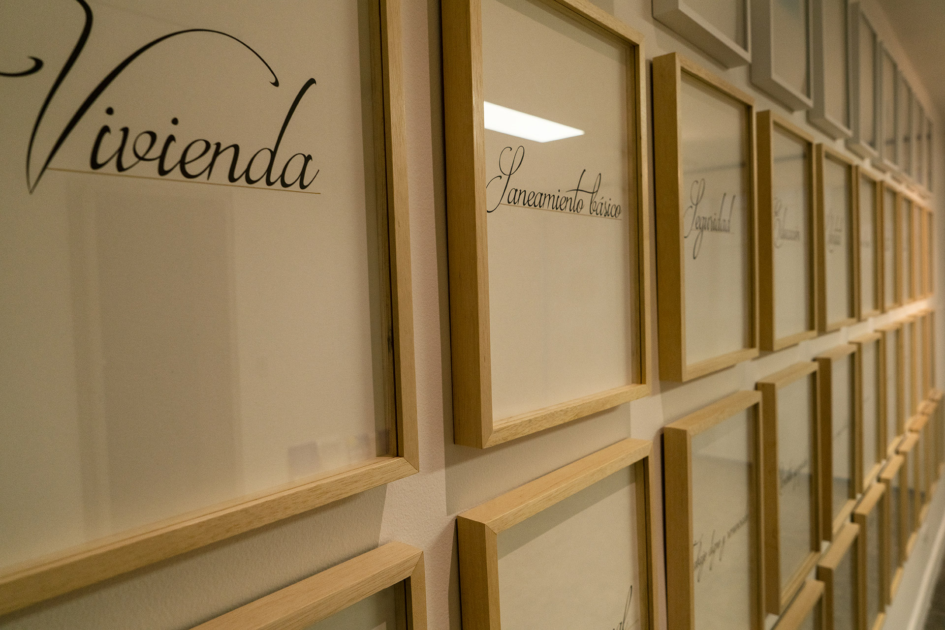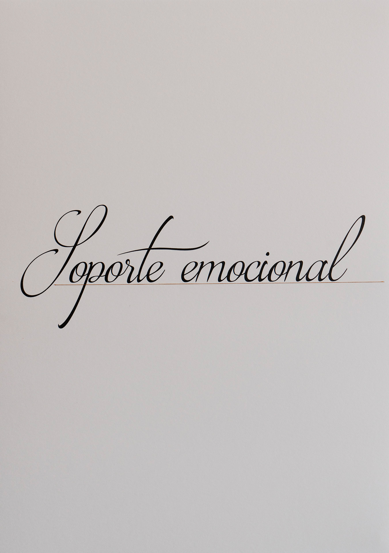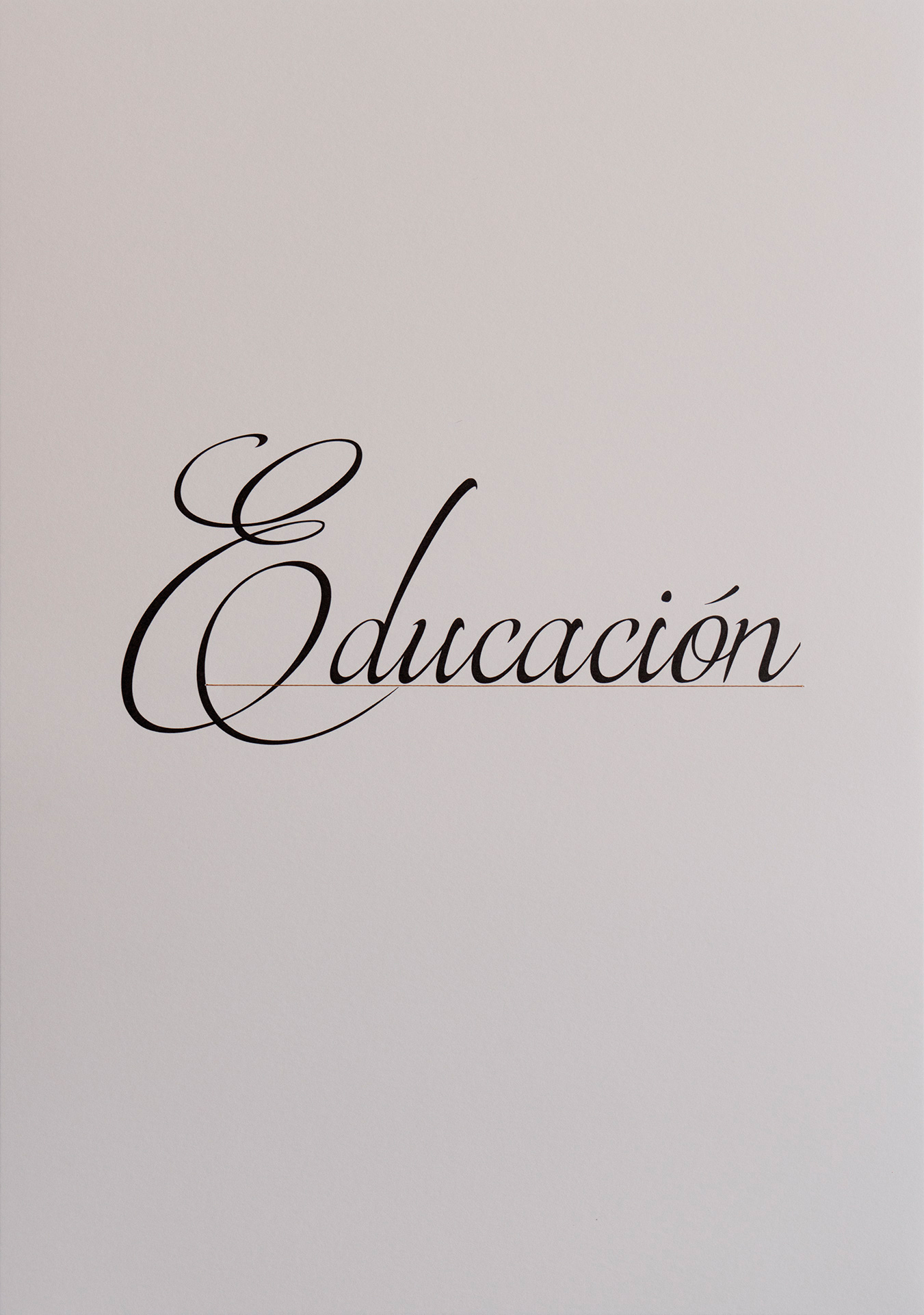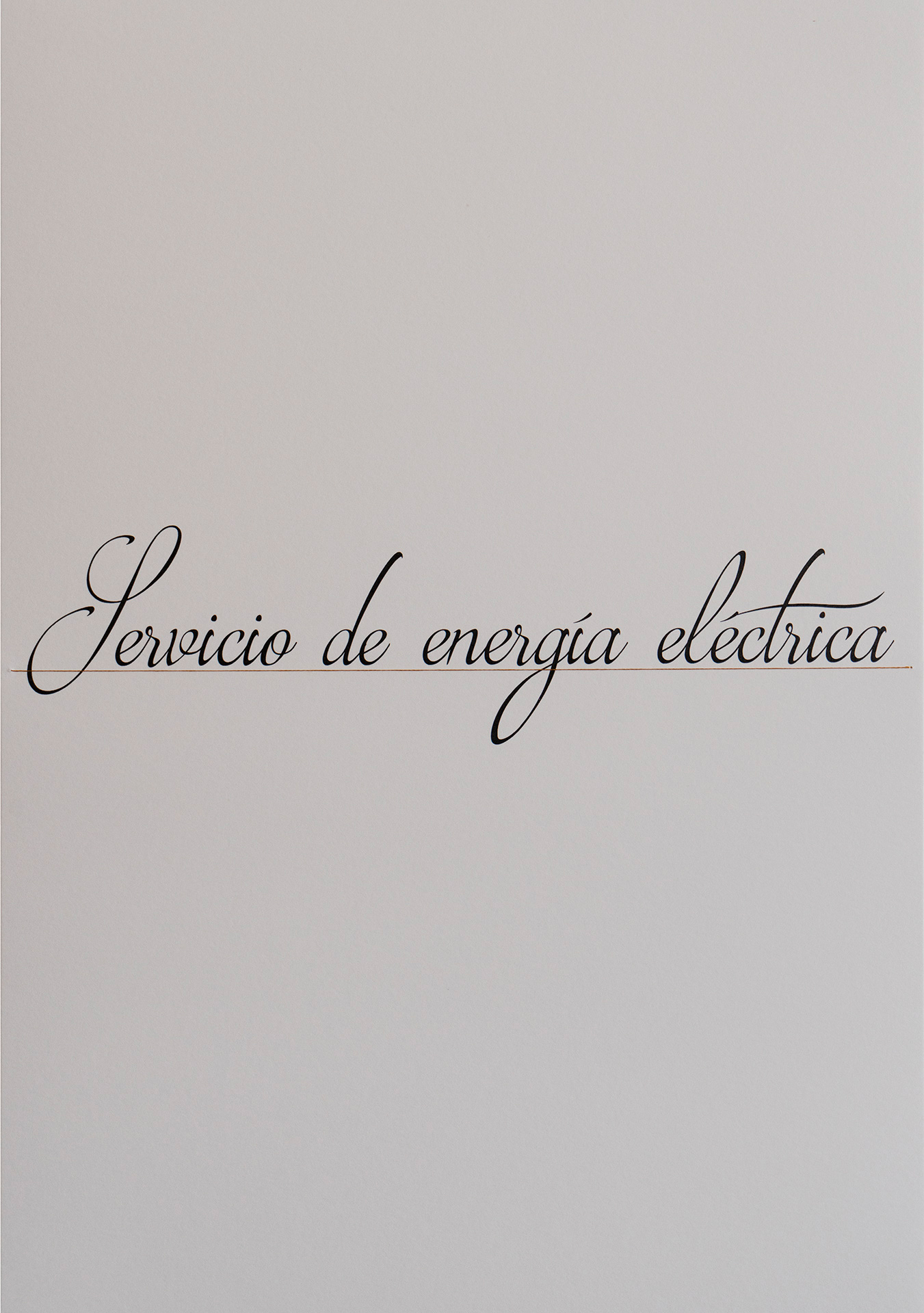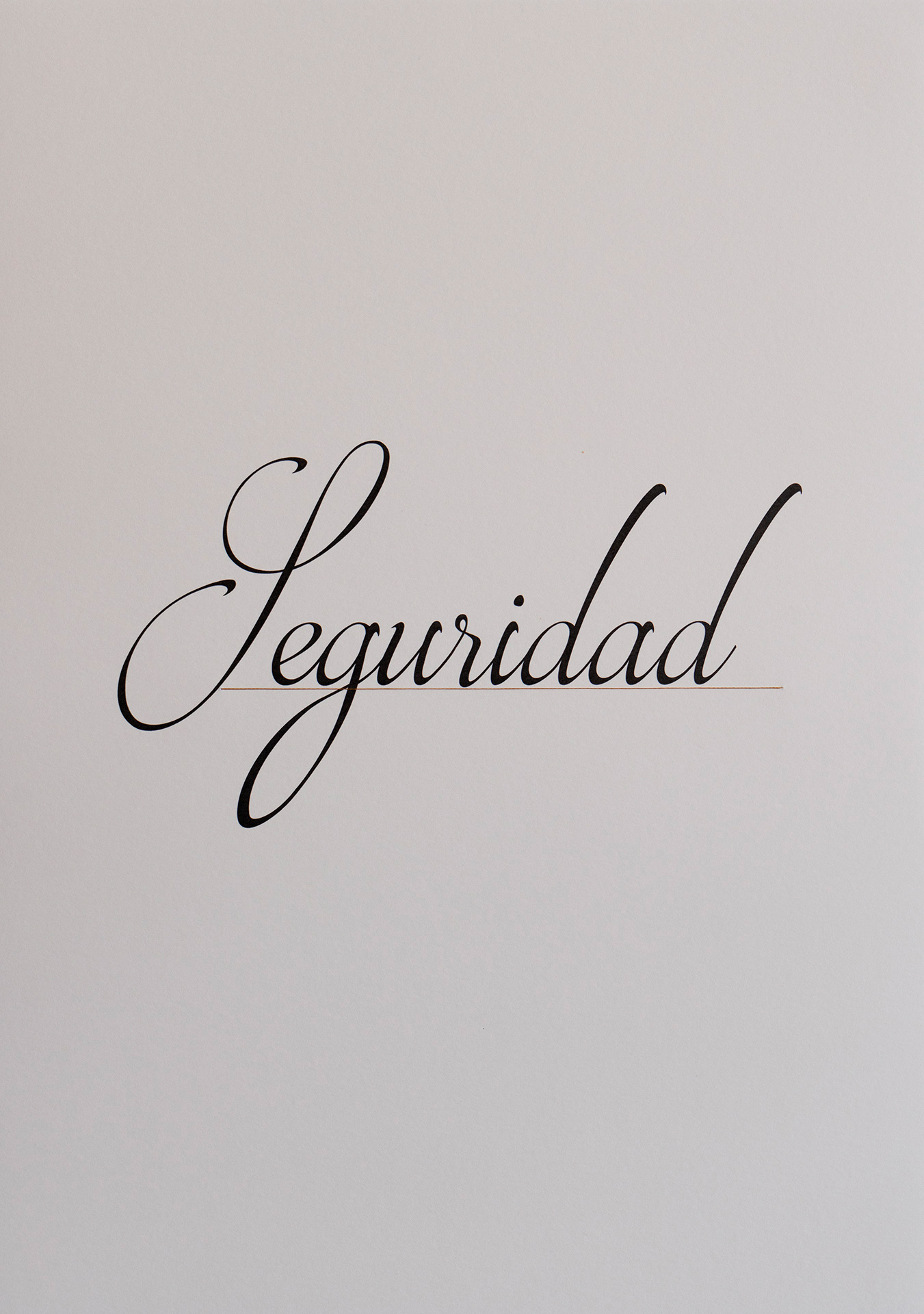 Segunda parte: está compuesta por 15 intervenciones sobre papel. Quince palabras y frases que aluden a las necesidades básicas de cada ser humano. Estas son: Vivienda, saneamiento básico, seguridad, educación, libertad, agua limpia, vestido, cobertura de salud, paz, diversión, descanso, soporte emocional, trabajo digno y remunerado, alimentos apropiados, servicio de energía eléctrica. Cada palabra o frase está intervenida con hilo dorado; hago referencia a los antiguos papiros en los que se usaba tinta dorada y negra para resaltar y embellecer los documentos oficiales. De alguna manera, para elegantizar algo que realmente debería darse sin tantos protocolos. De esta premisa, nace también la elección de la tipografía.