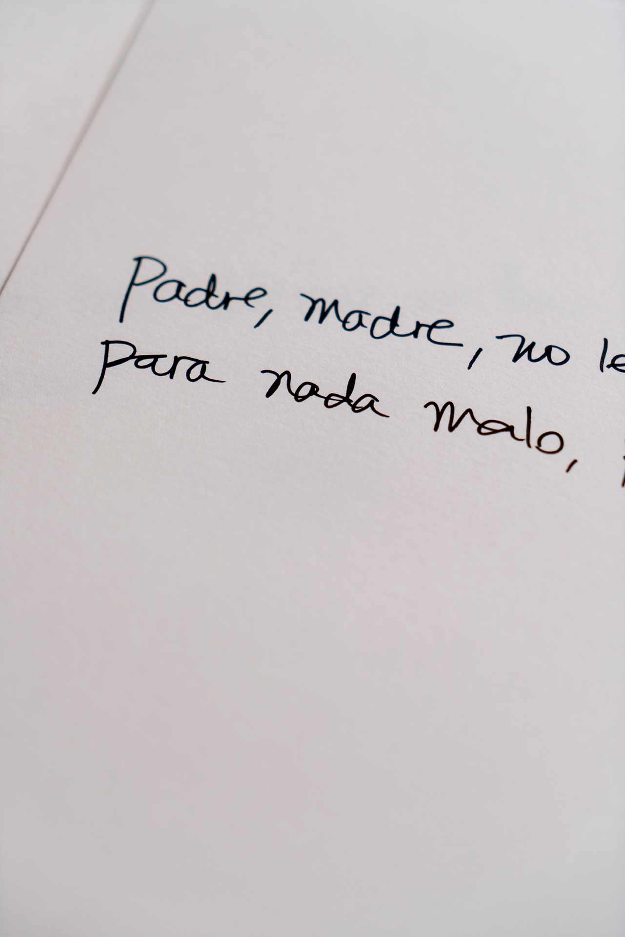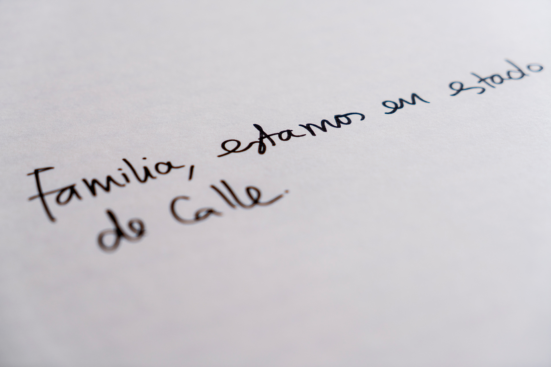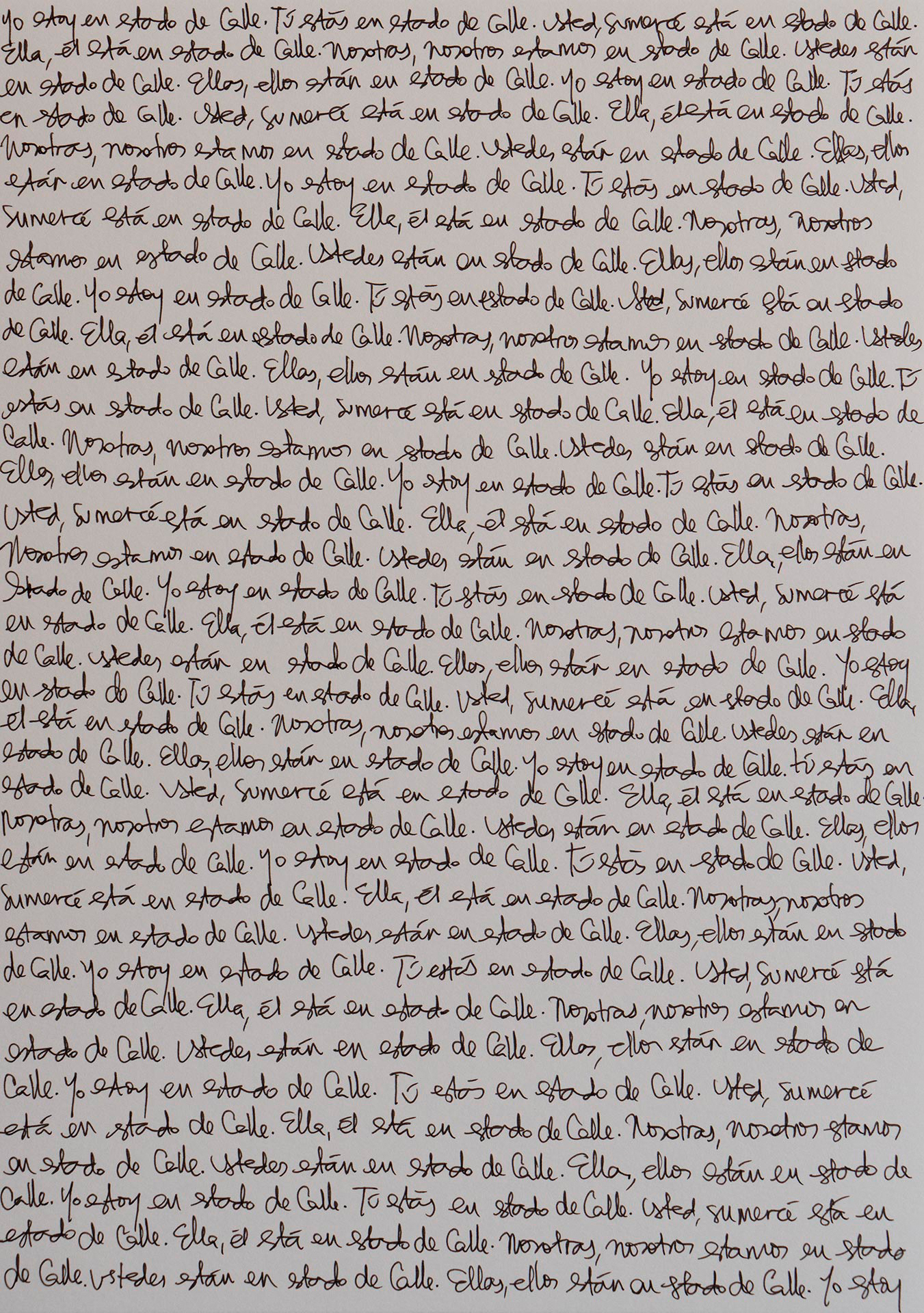 Cuarta parte: me meto de lleno en la frase “Familia, estamos en estado de calle”, hago una planilla en donde repito la frase con cada pronombre personal, incluyendo los pronombres personales utilizados en Colombia: como Usted y Sumercé, escribí el texto de inicio a fin; atenta, intentando sentir cada palabra de ese lamento del padre de familia que entonaba la súplica de ayuda. No intervengo con hilos.