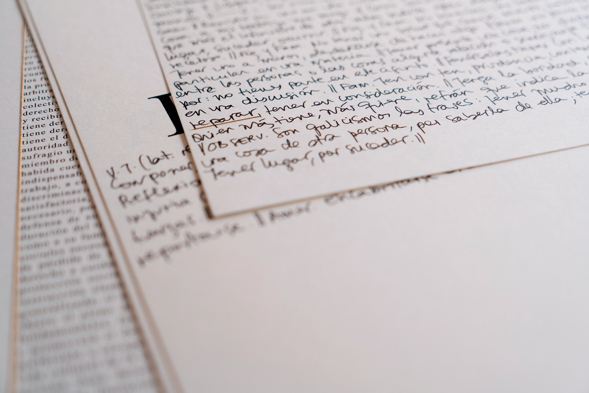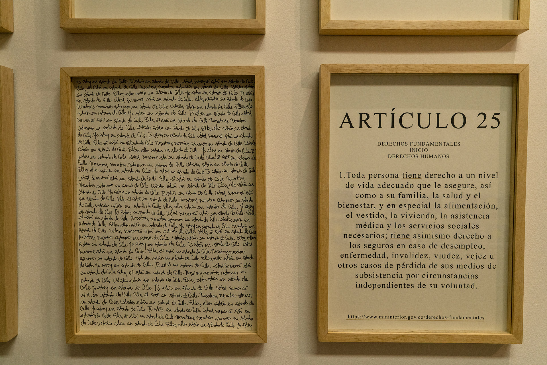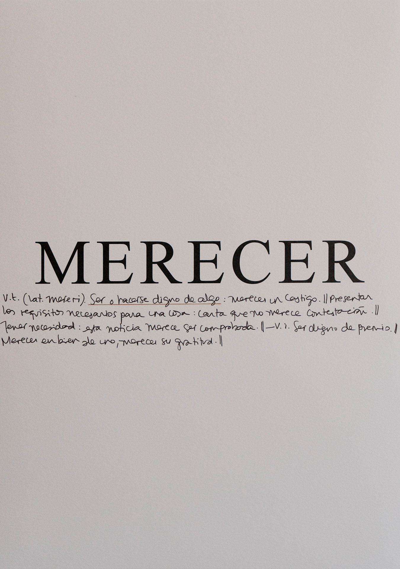 Quinta parte: comienzo haciendo referencia al artículo 25 de la declaración de los derechos fundamentales firmados por Colombia ante la ONU. Me concentro en el verbo “tener” y a partir de ahí hago un juego de palabras que obtengo de la definición de cada uno de los verbos. Cada palabra nos conduce hacia otra hasta llegar nuevamente a que todos los ciudadanos de cualquier territorio deberíamos tener los mismos derechos y deberes. Todo esto, está intervenido con hilo dorado y utilicé una fuente de palo, con la que se escriben muchos de los documentos legales en la actualidad. Cada definición la escribí con mi letra, aludiendo a que “estos merecimientos” pertenecen a seres humanos y no deberían quedarse única y bellamente registrados en un papel. Esta parte se compone de 6 intervenciones sobre papel: