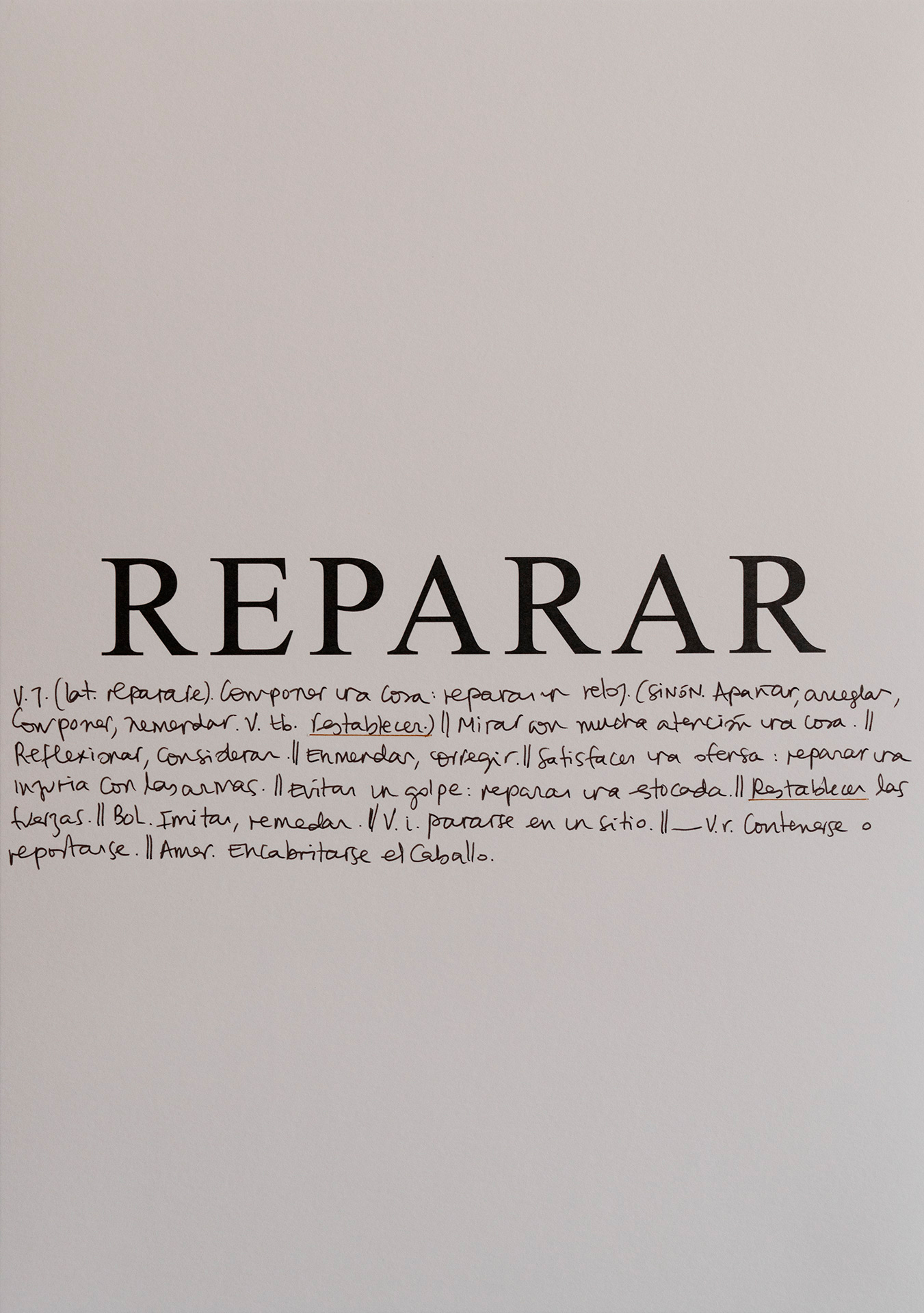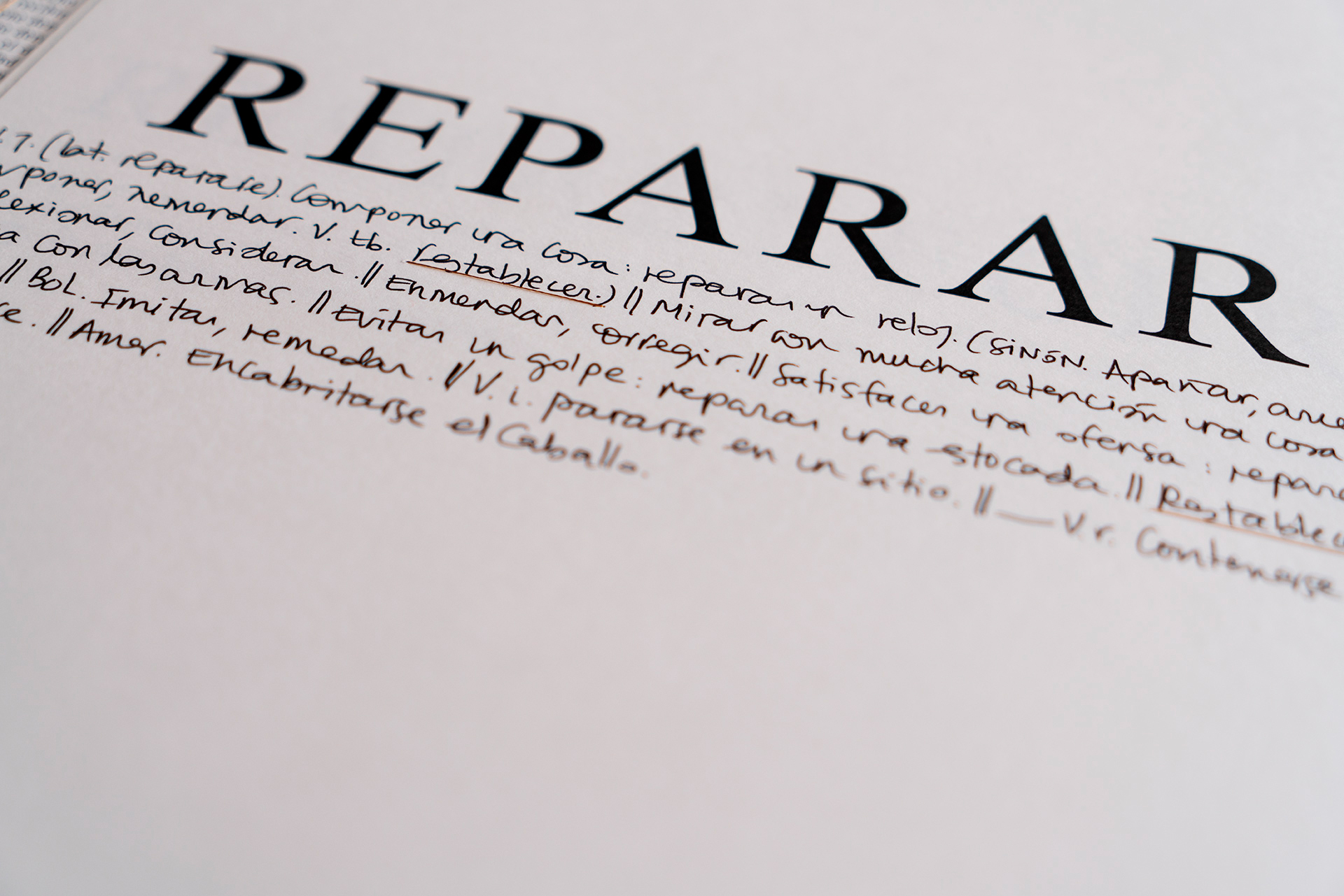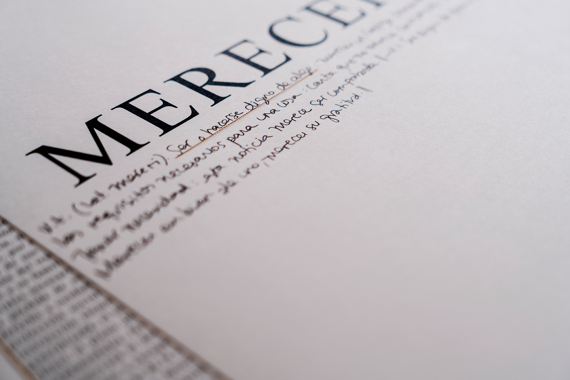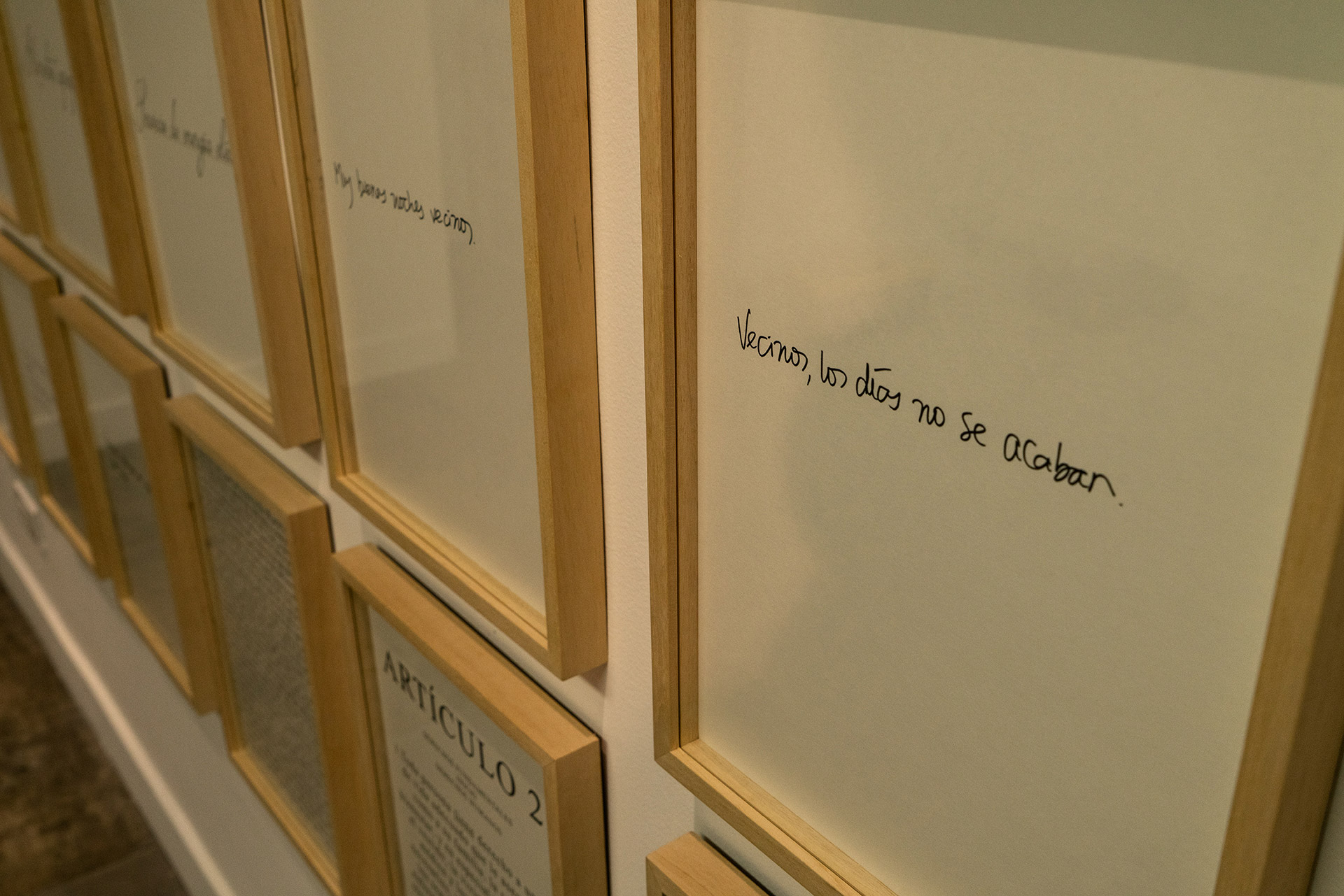 Quinta parte: comienzo haciendo referencia al artículo 25 de la declaración de los derechos fundamentales firmados por Colombia ante la ONU. Me concentro en el verbo “tener” y a partir de ahí hago un juego de palabras que obtengo de la definición de cada uno de los verbos. Cada palabra nos conduce hacia otra hasta llegar nuevamente a que todos los ciudadanos de cualquier territorio deberíamos tener los mismos derechos y deberes. Todo esto, está intervenido con hilo dorado y utilicé una fuente de palo, con la que se escriben muchos de los documentos legales en la actualidad. Cada definición la escribí con mi letra, aludiendo a que “estos merecimientos” pertenecen a seres humanos y no deberían quedarse única y bellamente registrados en un papel. Esta parte se compone de 6 intervenciones sobre papel: