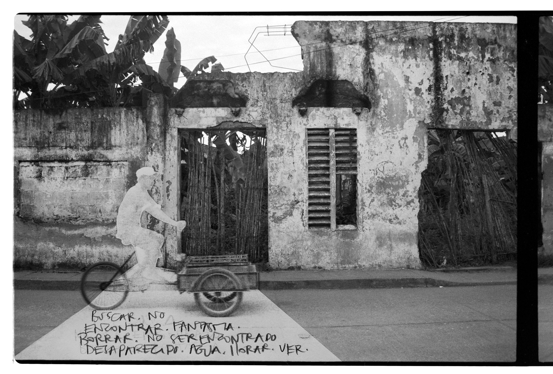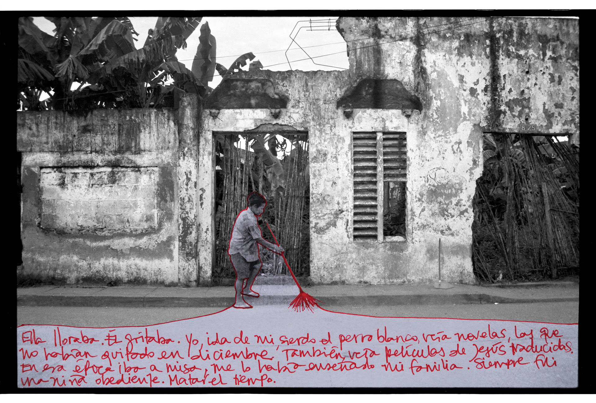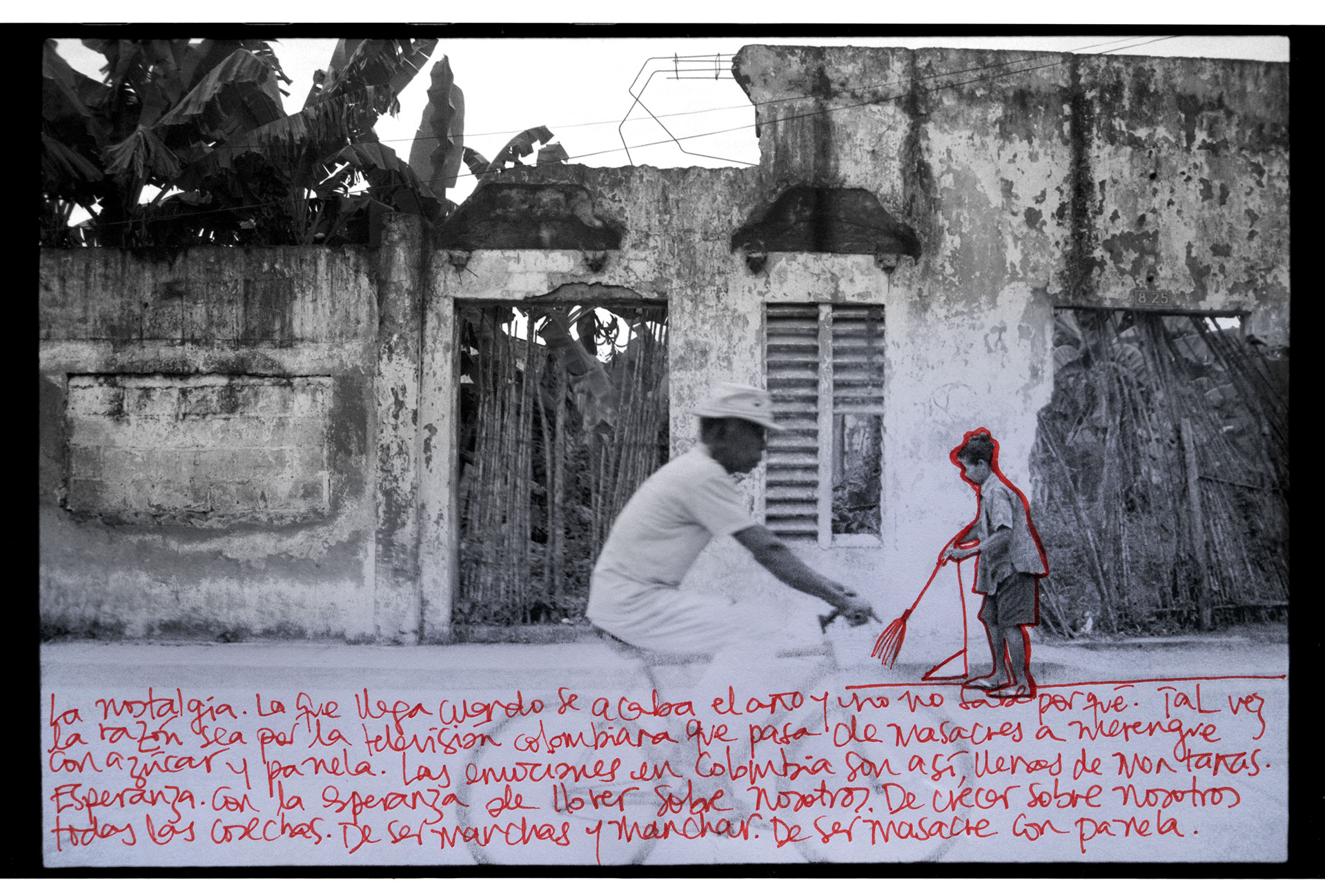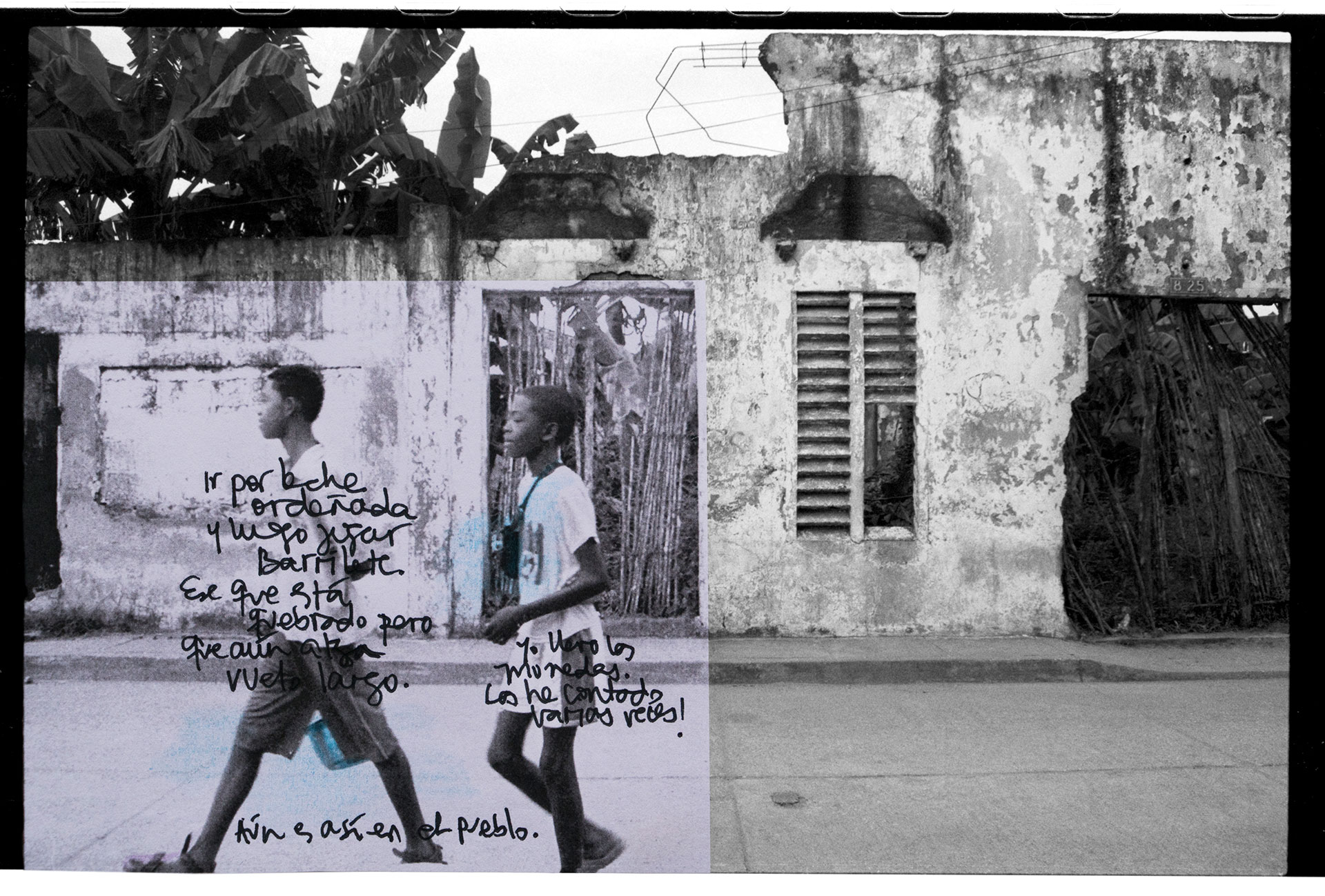 Una pared puede tener muchos significados. Históricamente, se han erguido como superficies divisorias, como objetos que denotan un límite y también, como construcciones que invitan al misterio, porque sabemos que detrás de ellas se oculta algo que no está al alcance de los ojos. “La pared del Viento” nace como un ejercicio de observación de la pared vecina del lugar de infancia así como de las personas que transitaban por él. Dicho ejercicio despertó en mi memoria un sinnúmero de recuerdos que decidí plasmar bajo la forma de texto, dibujo y yuxtaposición de imágenes sobre unas fotografías que había tomado en años anteriores. Desde aquellas épocas, pensaba la pared como un ser móvil, por esta razón la imagen no es siempre la misma aunque se pueda notar fácilmente que fueron tomadas en el mismo lugar. Estas imágenes, terminan siendo el lienzo en donde me atreví a contar fragmentos de mi historia personal. Recrearlas se convirtió en recrear algo en mí, y en el ejercicio de desempolvar un pasado, se vislumbró parte de un subconsciente social como es el caso de los desaparecidos, la violencia sicológica contra la mujer y el cotidiano simple de un pueblo pobre y olvidado de la costa caribe de Colombia. “La pared del Viento” es un ejercicio de observación donde la pared termina siendo un recurso para la creación y donde unos tras otros disolvemos el espacio y lo convertimos en nada y a su vez, en un mundo de posibilidades.